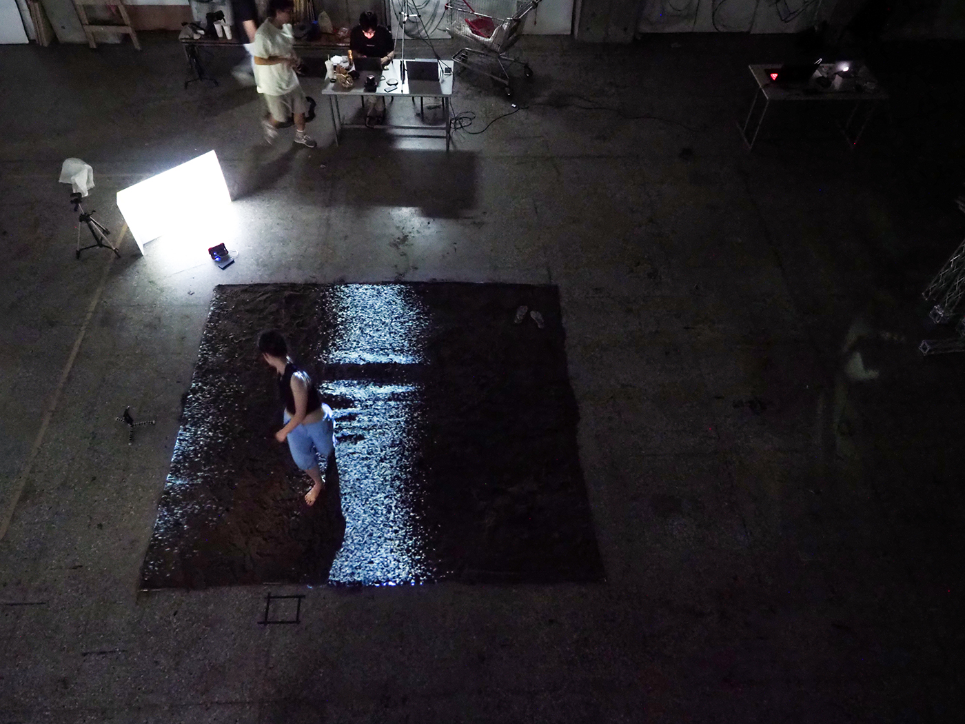作品以程式模擬海浪動態,利用粒子系統與色彩漸層,呈現浪花的噴濺與泡沫消散的細節。結合異材質的沙地投影,增添真實觸感。透過深度感測裝置偵測觀者位置,讓浪花自動繞過人體,觀者可透過移動與肢體動作,參與並改變海浪的節奏,營造出海浪與人互動的儀式感。